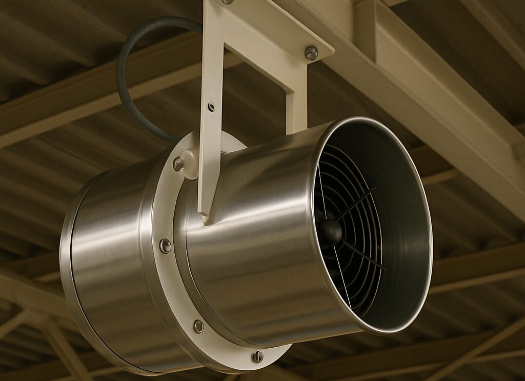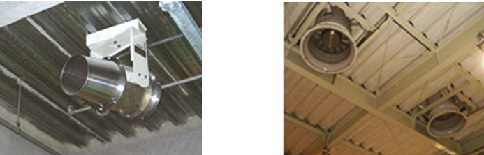 「工場工事センター匠.com」では、天井高や設備配置を考慮した立体的な空気循環設計を実施しております。天井付近の熱溜まりを排出するなど、工場内の構成を考慮した気流制御設計を行っております。また、壁面や天井に設置される大型ファンの角度・風速を現場に合わせて調整し、工場内の空気の流れを最適化しております。