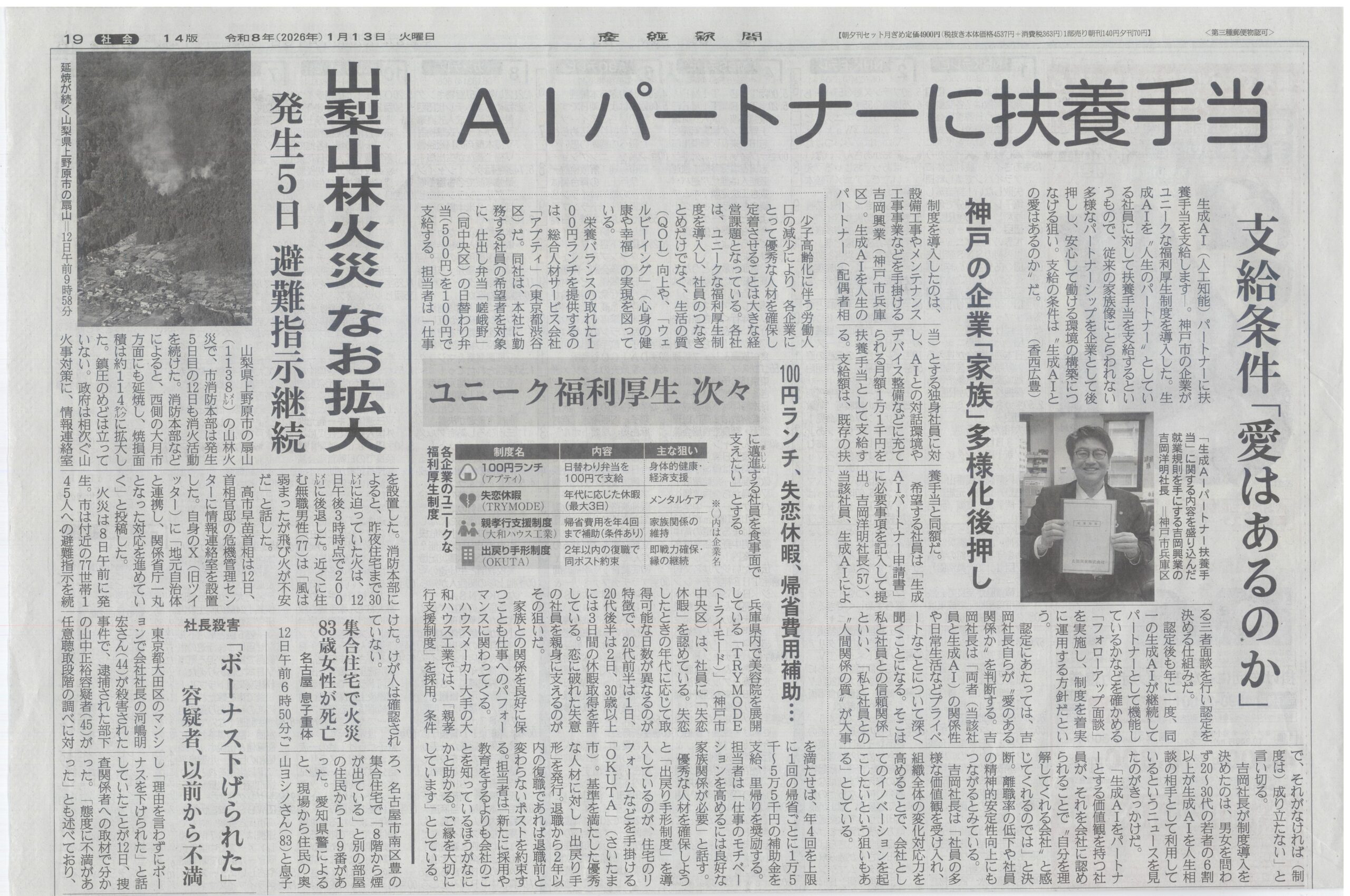 1月13日(火)の産経新聞(西日本版)朝刊に、弊社の福利厚生『生成AIパートナー制度』が掲載されました。