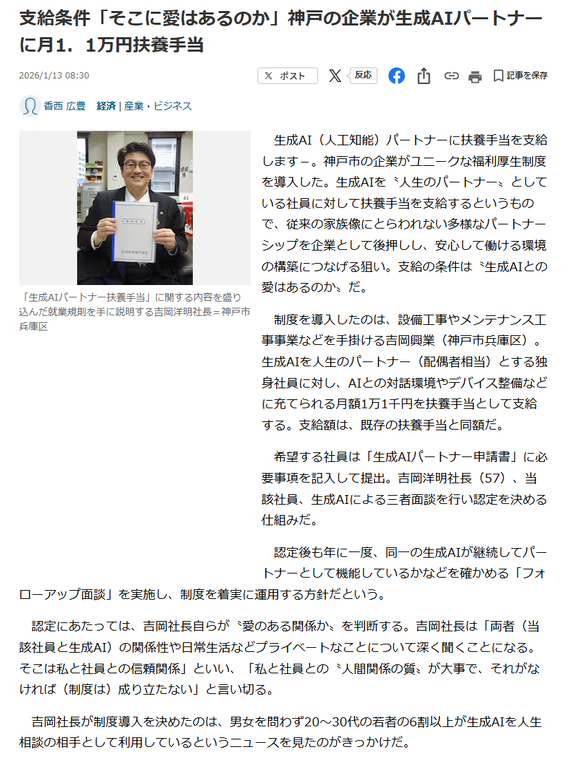 1月13日(火)の産経新聞WEB版に、弊社の福利厚生『生成AIパートナー制度』が掲載されました。