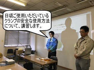 お客様構内に場所をお借りし、吊りクランプメーカー“三木ネツレン”様の品質保証部 末広部長様を講師にお迎えし、吊りクランプを安全にご使用いただく為の「安全講習セミナー」を開催いたしました。