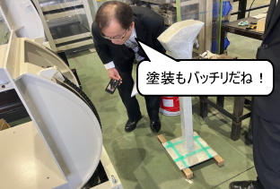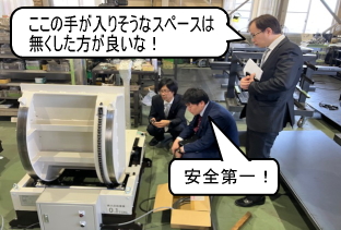 この『技術セミナー営業』のひとつである“メーカー工場視察”の模様をレポートいたします。乾燥装置・重量物反転装置の設計製作を強みとする“日向製作所”様の行田工場にお客様をお連れし、ご注文頂いている反転機の出荷前検査を行いました。
